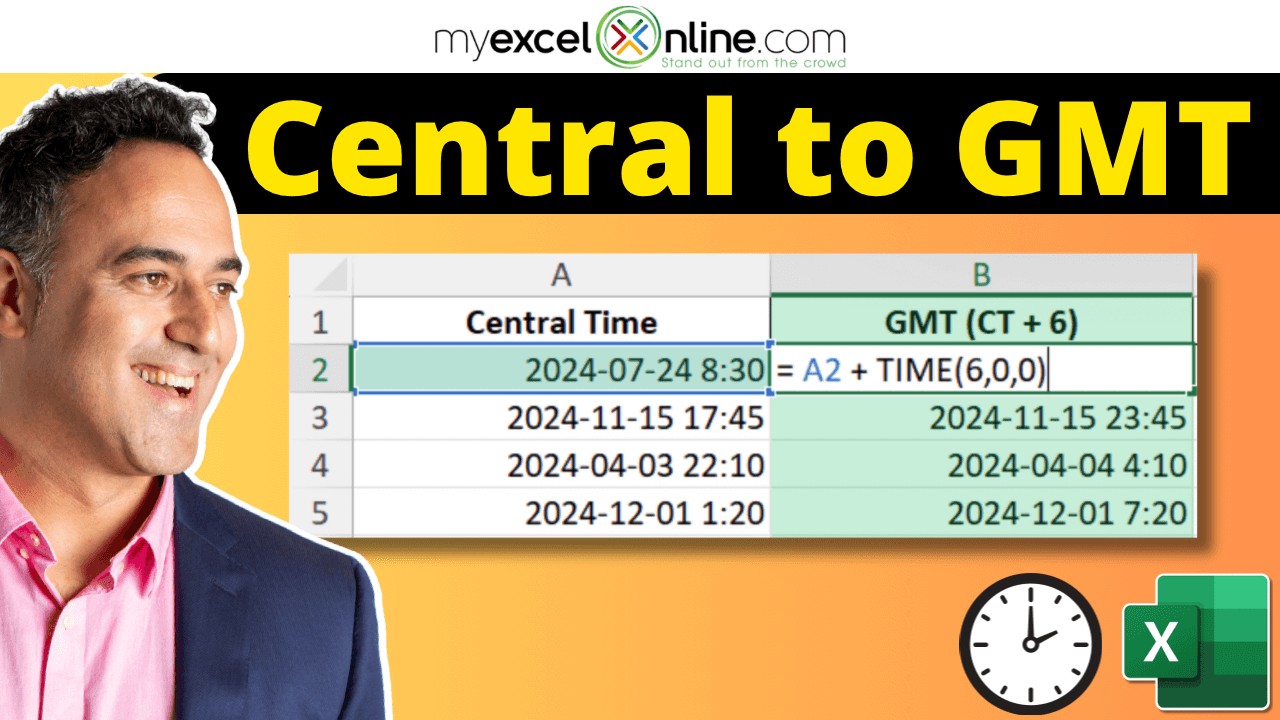 Assume your Central Time data is in column A, starting from A2. The values are either time-only (e.g., 8:30 AM) or datetime (e.g., 2024-07-24 08:30).