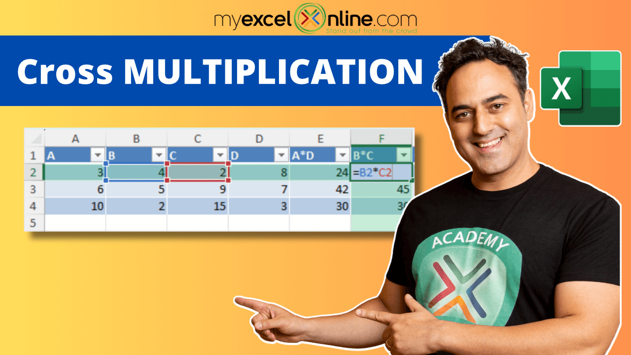 No built-in function, but Excel’s basic arithmetic operators allow you to perform cross multiplication easily using formulas.