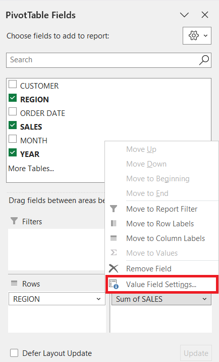 - Rows: These are used to group data into categories, such as Product, Region, or Customer.
