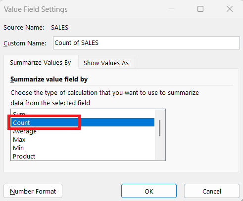 Drag the relevant field into the Values area. Click the drop-down arrow and select Value Field Settings.