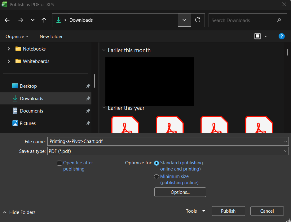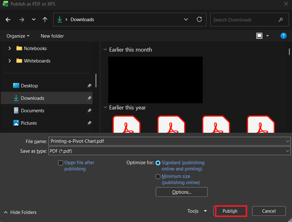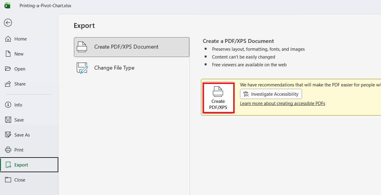 - You can save your Pivot Chart as a PDF using “Microsoft Print to PDF.”