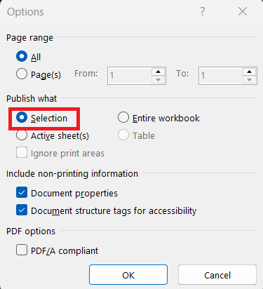- In Options, select “Selection” if you want to print only the chart, or “Entire Workbook” if you want everything.