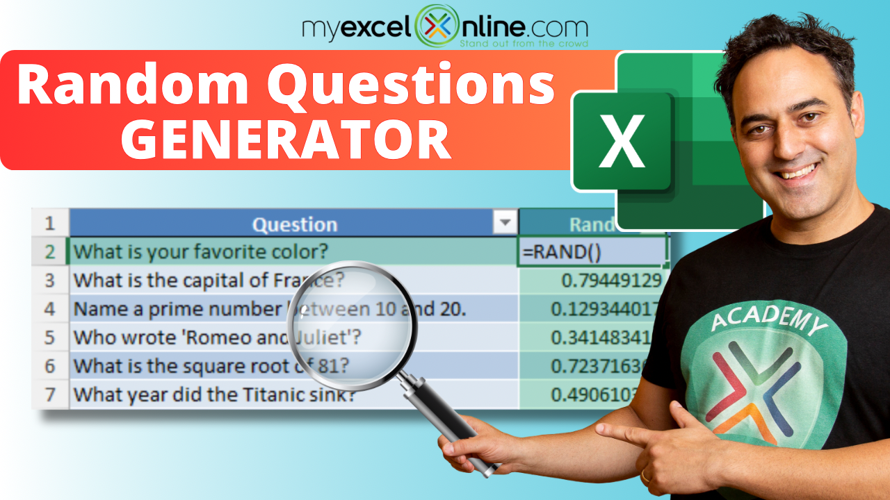 A random question generator selects an item at random from a list of questions. This is useful for classroom quizzes, training reviews, meeting icebreakers, or even board game sessions. With Excel, you can generate random selections from any list and customize the setup for your needs.