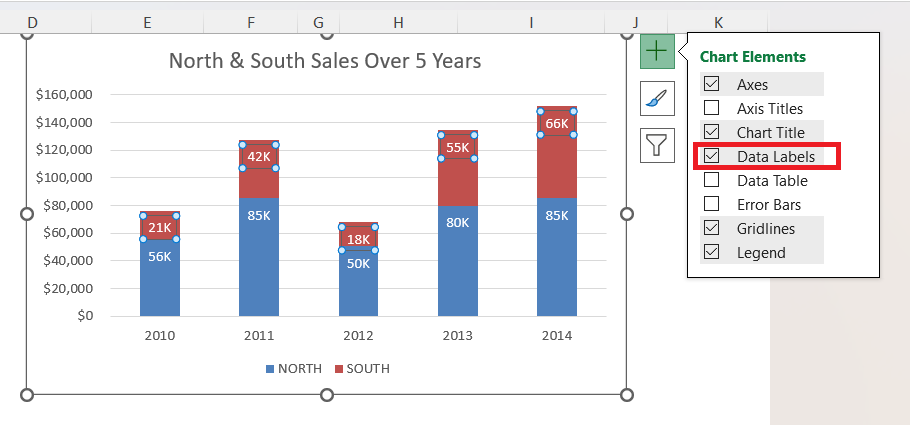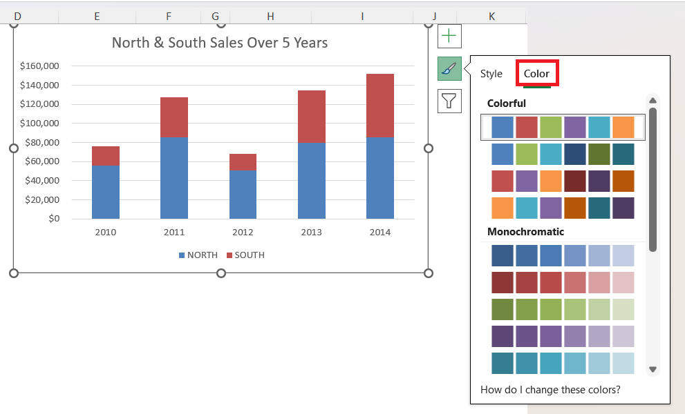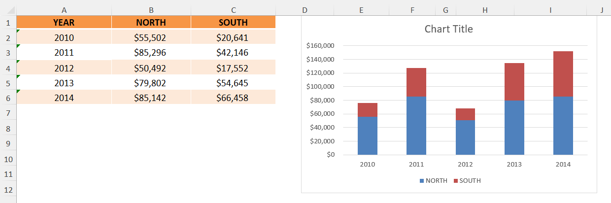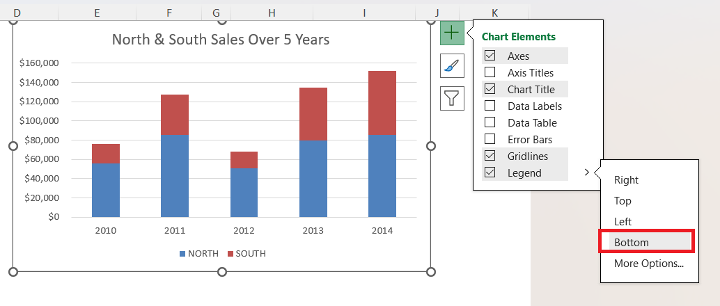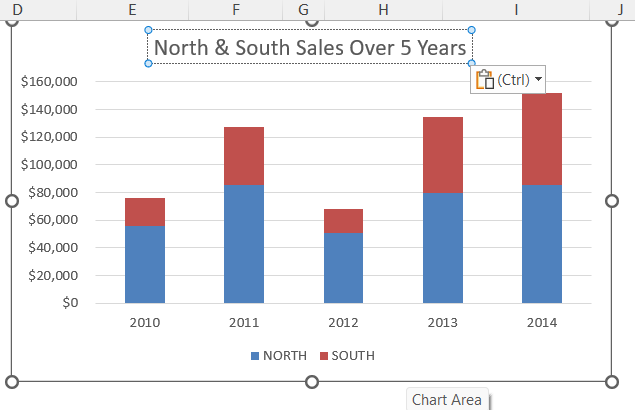 - Chart Title: I rename it to something meaningful, like North & South Sales Over 5 Years.