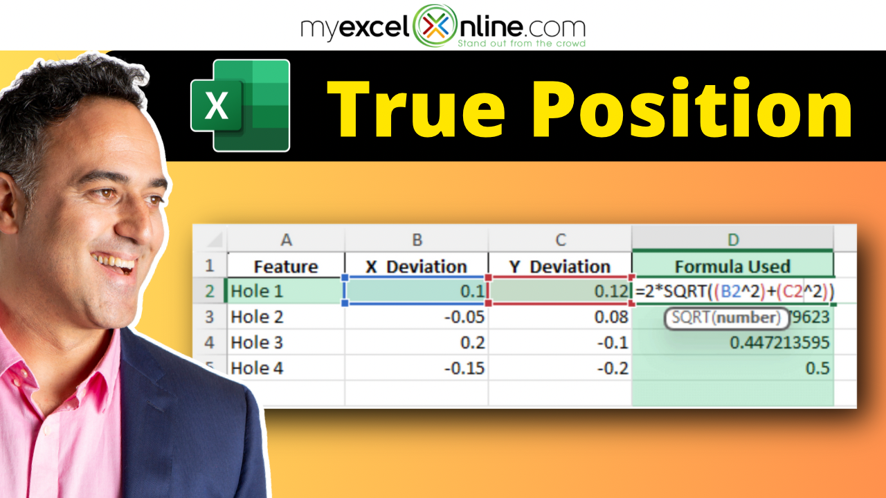 True Position = 2 * SQRT((Xdeviation)^2 + (Ydeviation)^2). - Excel makes it easy to calculate True Position using built-in formulas.